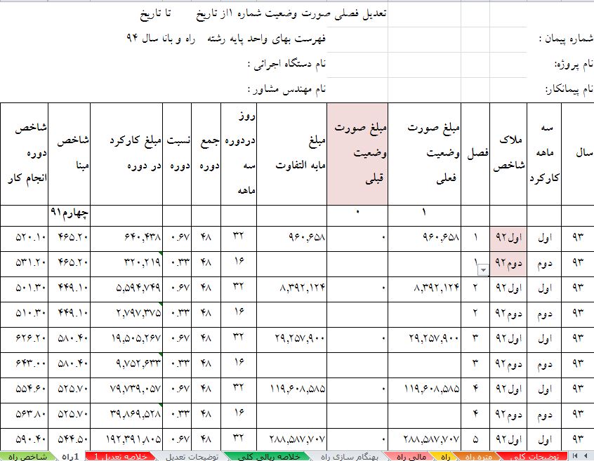 فایل EXCELL متره و برآورد راه بر اساس فهرست بهای راه و باند ۱۳۹۴ قابل استفاده برای تهیه صورت وضعیت و تعدیل ونیز برآورد پروژه ها ،با قابلیت ویرایش توسط کاربر میباشد.این فایل توسط آقای مهندس فرخ رئیسی تهیه شده است.